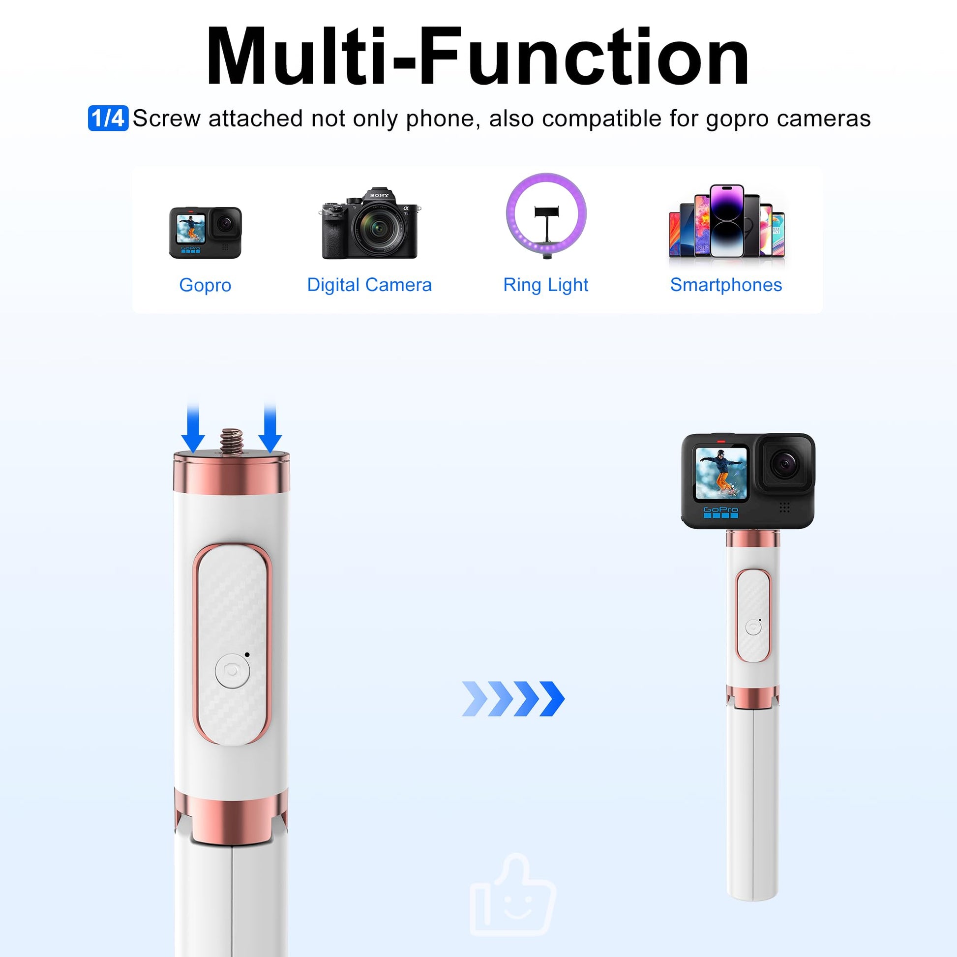- NEW UPGRADED - The versatile design allows you to use it as a support phone and GoPro sports camera, tripod, or desktop phone holder. ★ equipped with 1 x 1/4" screw adapter (work with gopro, webcam, and more devices) Perfect for selfies, vlogs, live streaming, group photos, etc.