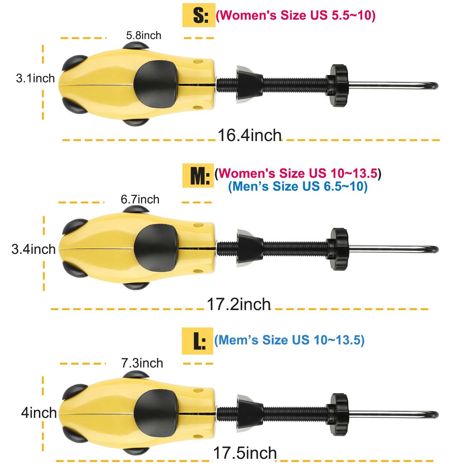 - 【4-WAY ADJUSTABLE SHOE EXPANDER; NOT SUITABLE FOR BOOTS !】 Eachway shoe stretchers provide 4-way stretching: Stretch width to widen shoe; Stretch length to increase shoe size; this Shoe stretchers are simple and work wonders for minimal stretching. Not only can they improve the fit of your favorite footwear, but can also help if you suffer from bunions, calluses, corns or other feet issues that cause pressure on the foot when inside of a shoe.