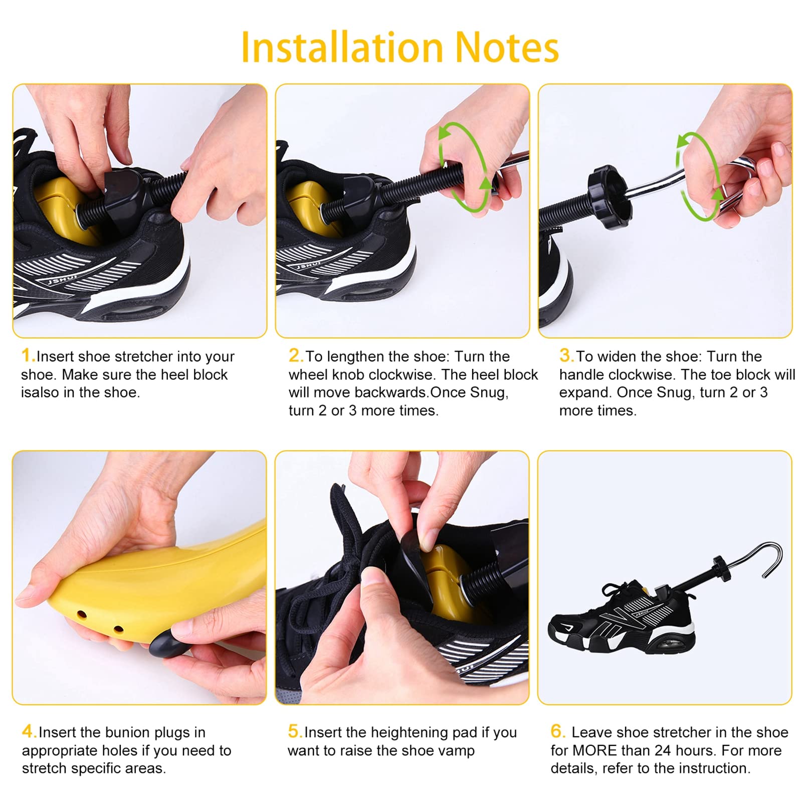 - Step:1.Insert shoe stretcher into shoewith the back piece facing down. 2.To adjust the length,rotate theknob clockwise. 3.To adjust the width,rotate thehook clockwise 4.Keep shoe stretcher in placeforat least 24 to 48 hours.The longer,thebetter.