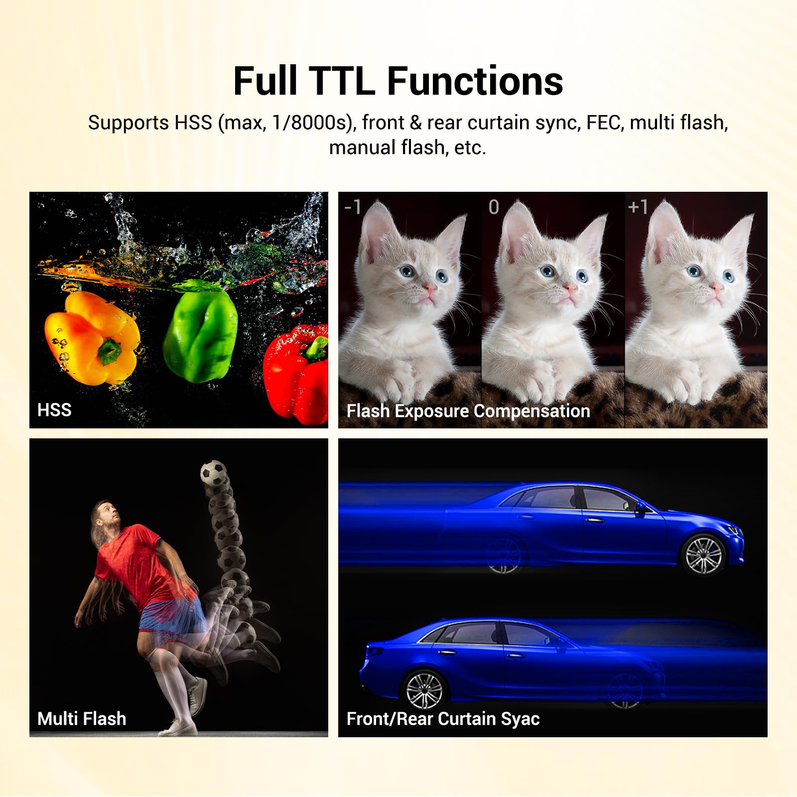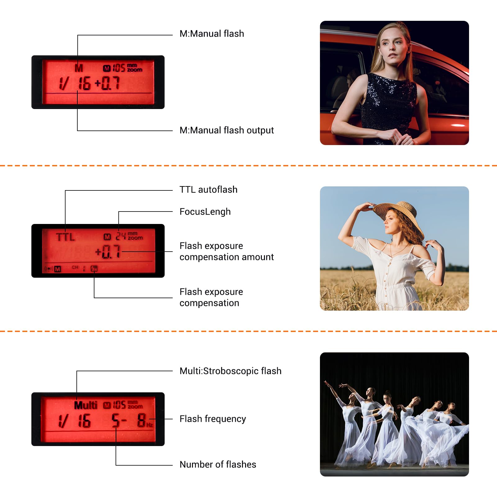 - Powerful and Comprehensive Function: Support TTL/M/S1/S2 modes, auto/manual zoom 24-105 m; HSS (max. 1/8000s), flash exposure compensation (FEC), front and rear curtain sync, multi flash, manual flash, manual focus assistance, these functions allow you to adapt to different scenes and shoot easily