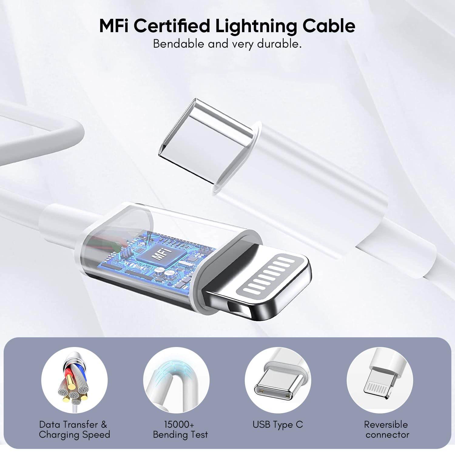 Apple Certified 10 feet lightning cable ensures 100% perfect compatibility with iPhone devices. IPhone Lightning Charger Cable is long enough to meet your free distance needs. The 10-foot iPhone charger cord is ideal for any occasion, allowing you to easily charge your device using iPhone charger in your bedroom, kitchen, etc. Besides, with this USB-C to Lightning cable, you can transfer data directly from your iPhone/iPad at up to 480Mbps.