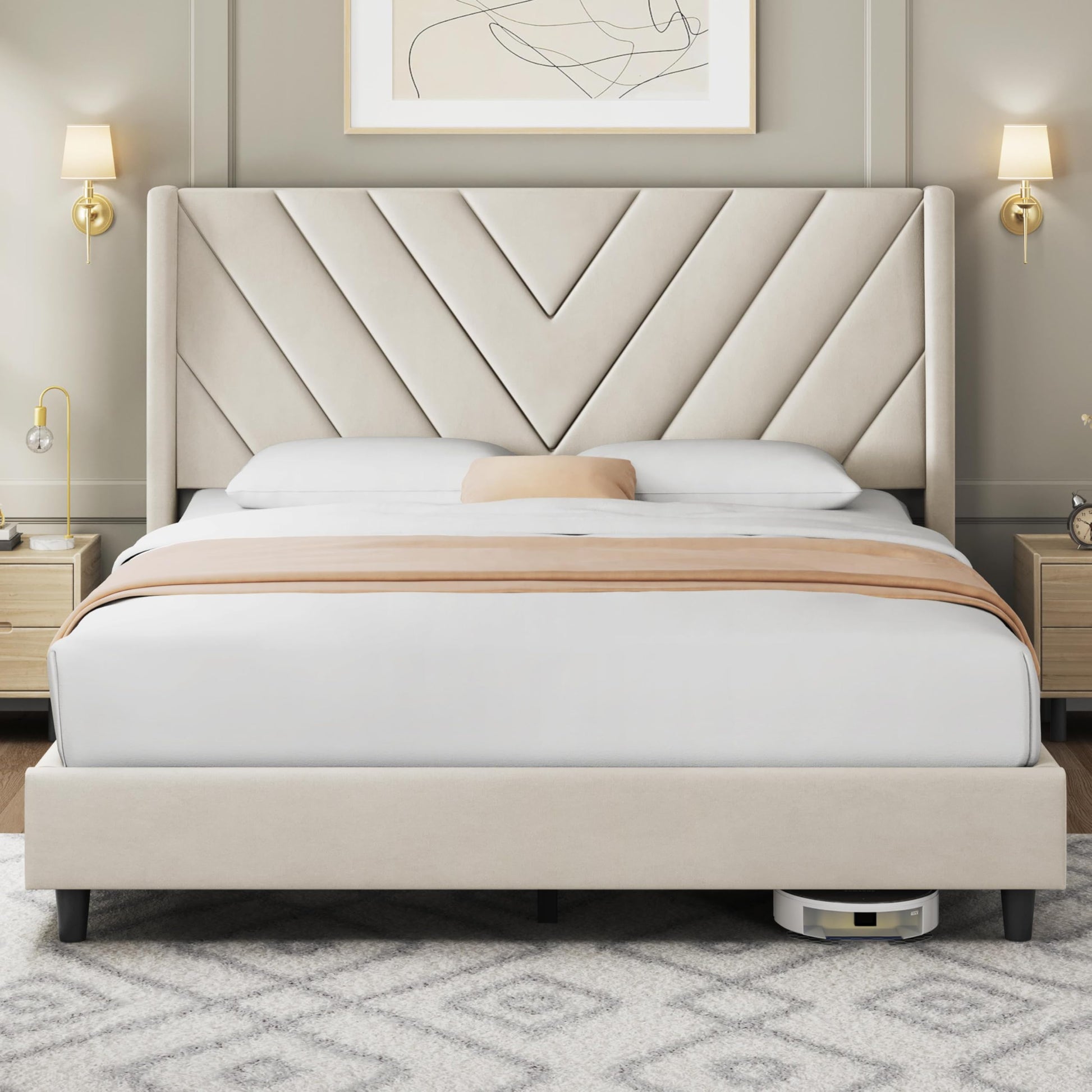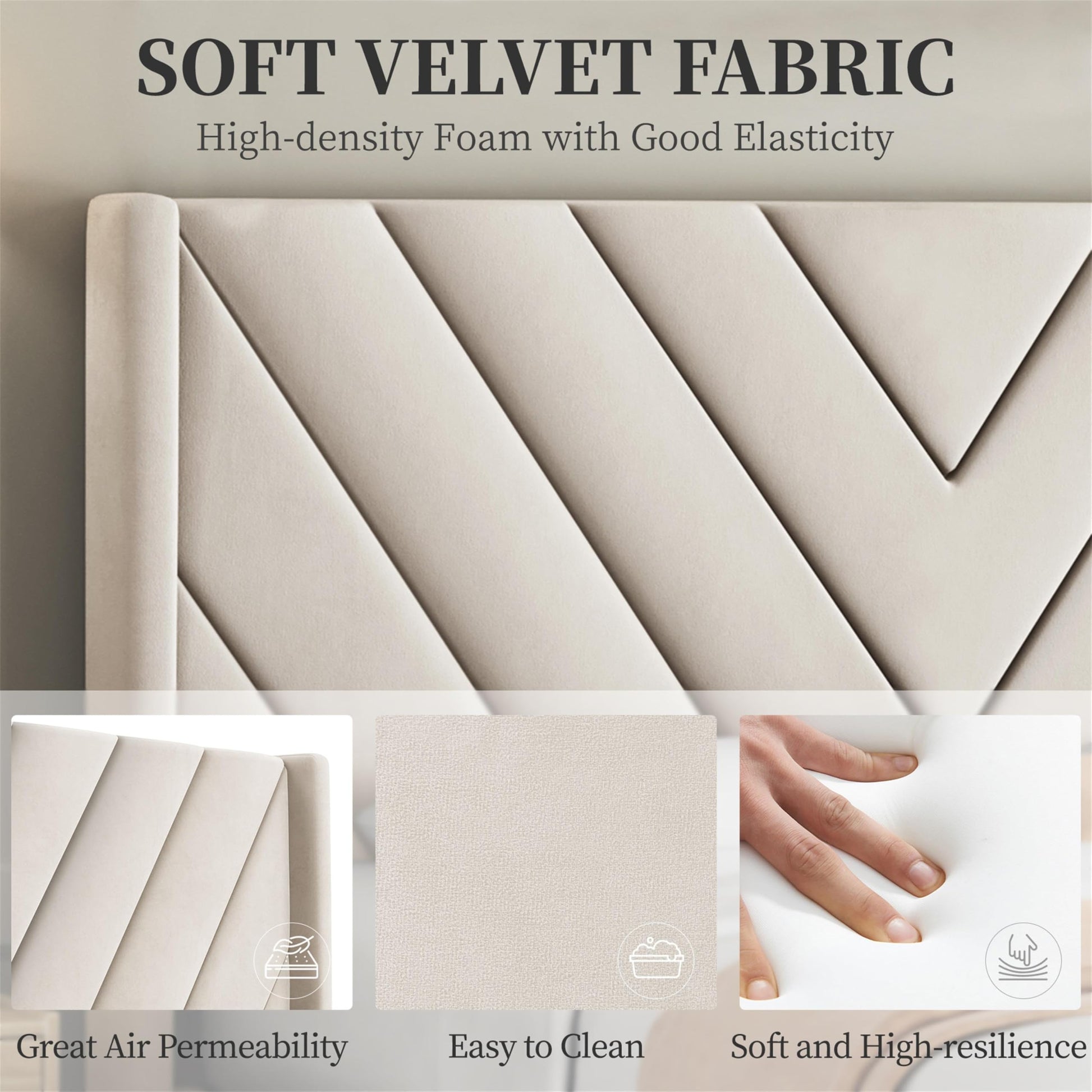 - Wing Side Design: Designed with a wing side on the wide upholstered headboard and skin-friendly velvet fabric, the queen bed frame can be a must-have in any restful retreat. (No Box Spring Needed)
